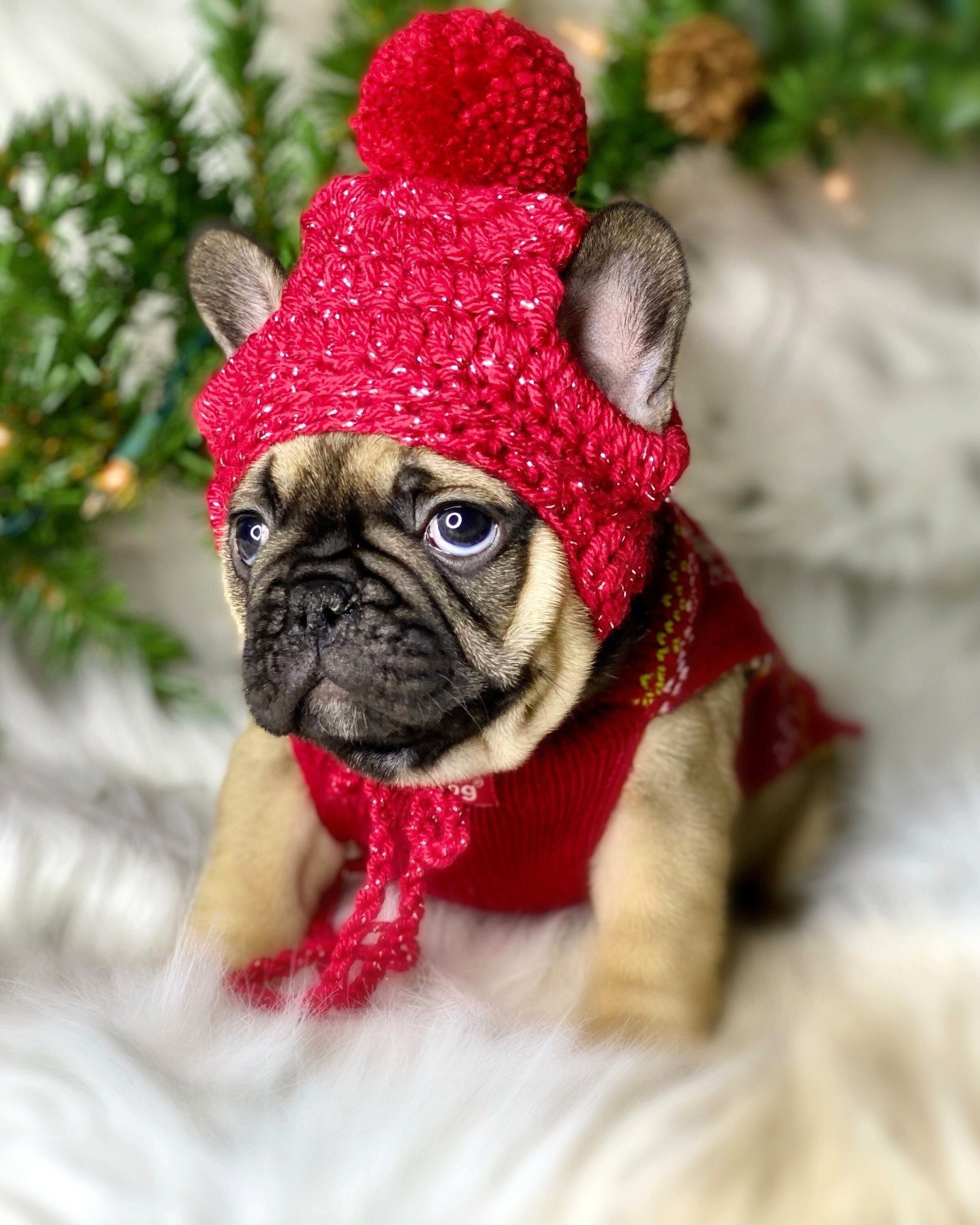Small Puppy Dog Holiday Knit Crochet Hats Beanie Toque Pompom Etsy Puppy Hats Dog Holiday Bulldog Puppies